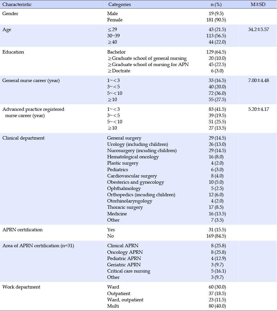 연구 진행은 2개의 상급 종합 병원과 6개의 종합 병원의 총 217명 설문 진행하였으나, 응답이 명확하지 못하고, 자료가 미흡한 17명을 제외하고, 총 200명에 대한 결과 분석을 진행하였다. 설문 대상자중 여자가 90.5%, 나이는 30세 이상에서 40세 미만이 113명으로 56.5%의 가장 많은 비율을 차지했으며, 평균 34.20세를 나타냈다. 학력은 대졸 129명(64.5%), 임상대학원 재학 중 이상이 45명(22.5%), 일반 대학원 재학 중 이상이 20명(10.0%)의 순서를 나타냈으며, 일반 간호사 경력으로는 5년 이상에서 10년 미만이 72명(36.0%)으로 가장 많았다. 또한 임상전담간호사 경력으로는 1년 이상에서 3년 미만의 경력이 83명으로 41.5%를 차지하고 있다. 근무 임상과는 일반 외과 29명(14.5%), 신경외과 29명(14.5%), 비뇨의학과 26명(13.0%)로 수술적 치료가 요구되는 임상과가 많은 비율을 차지하고 있으며, 전문간호사 자격증이 없는 경우가 169명(84.5%)으로 있는 경우보다 높은 비율을 차지하였다. 자격증 소지자 중에는 임상 8명(25.8%), 종양 8명(25.8%) 순으로 나타났으며, 업무 영역으로는 병동부터 외래, 검사실까지 다양한 영역에서 모두 수행하는 경우가 80명(40.0%), 병동 업무가 60명(30.0%) 순으로 많은 수를 차지하였다(Table 1).