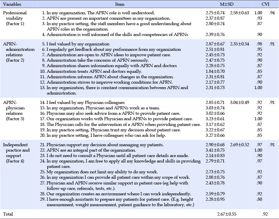 After translation using a committee approach and an expert group’s verification of the content validity, items were classified as 'professional visibility', 'APRN-administration relations', 'APRN-physician relations', 'independent practice and support' A total of 29 questionnaire items were developed for the four factors. Data were collected from 200 advanced practice registered nurses working at two advanced general hospitals and six general hospitals.