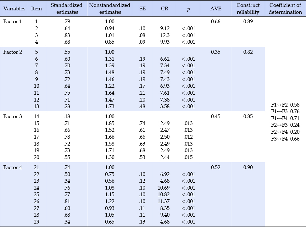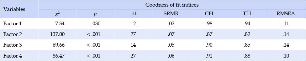 본 연구에서는 모형 적합도 평가 지수로 절대적합지수인 카이 제곱값, 잔차공분산(SRMR), 근사치 오차 평균 제곱근(RMSEA)을 포함하였고, 추가로 증분 적합지수인 적합지수(CFI), 터거 루이스 지수(TLI)를 확인하였다. 번안된 전문간호사 근무환경 측정도구(NP-PCOCQ)의 하위 영역별 적합도 지수를 살펴본 결과, 모든 영역의 카이 제곱 통계량이 p-value가 .05 이하를 나타냈으며, 잔차공분산(SRMR)은 모든 항목에서 0.08 이하로 적합 평가 수치에 합당한 것으로 나타났다. 근사치오차 평균 제곱급(RMSEA) 값은 0.10 이상으로 나타났으며, 적합지수(CFI)와 터거 루이스 지수(TLI)는 각각 제일 낮은 요인의 점수가 0.87, 0.82 이상으로 1에 가까운 수치를 보였다(Table 3).