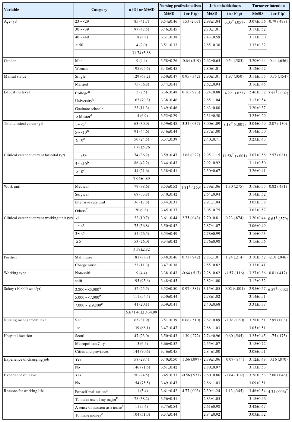 대상자의 평균연령은 31.74±5.88세로, 30∼39세가 97명(47.5%)으로 가장 많았으며, 성별은 여성이 195명(95.6%), 결혼상태는 미혼이 129명(63.2%), 최종학력은 간호학사가 162명(79.3%)으로 가장 많았다. 총 간호사 경력은 평균 7.78±5.26년, 현 병원 근무기간은 평균 7.04±4.89년, 현 부서 근무기간은 평균 3.59±2.82년이었다. 근무부서는 내과계 병동이 79명(38.6%), 직위는 일반간호사가 181명(88.7%), 근무형태는 교대근무가 195명(95.6%)으로 많았다. 연수입은 5,000만원 이상 7,000만원 미만이 111명(54.4%)으로 가장 많았으며, 평균은 5,671.46±1,434.99만 원이었다. 간호관리료 등급은 1등급이 139명(68.1%), 병원 소재 지역에서는 기타 시•도가 144명(70.6%), 대상자들의 이직 경험 여부는 없는 경우가 146명(71.6%), 휴직 경험 여부는 없는 경우가 154명(75.5%), 직장생활 이유는 경제적인 도움을 받기 위한 경우가 104명(51.0%)으로 가장 많았다 (