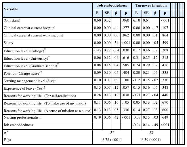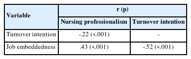 These findings suggest that increasing job embeddedness can reduce nurses' turnover intention. Therefore, to decrease nurses' turnover intention, it is essential to enhance nursing professionalism while simultaneously promoting job embeddedness.