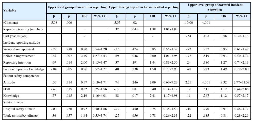 Predictors of the upper level group of near miss reporting were belief in improvement (odds ratio [OR], 2.40; 95% confidence interval [CI], 1.27-4.53), reporting intention (OR, 2.00; 95% CI, 1.15-3.47), patient safety knowledge (OR, 2.16; 95% CI, 1.16-4.01). Predictors of the upper level group no harm incidents reporting were reporting training (OR, 1.38; 95% CI, 1.01-1.90), belief in improvement (OR, 2.00; 95% CI, 1.01-3.95), patient safety knowledge (OR, 2.41; 95% CI, 1.17-4.98). In the case of harmful incident reporting, the predictor was patient safety attitude (OR, 9.32; 95% CI, 2.77-31.38).