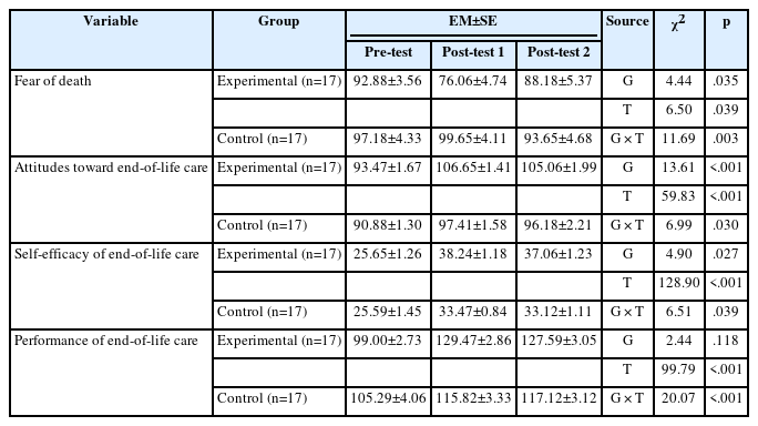 Compared to the control group, the experimental group showed a significant reduction in fear of death (χ2=11.69, p=.003) and significant improvements in attitudes toward end-of-life care (χ2=6.99, p=.030), self-efficacy of end-of-life care (χ2=6.51, p=.039), and performance of end-of-life care (χ2=20.07, p<.001) both immediately and 4 weeks after the intervention.