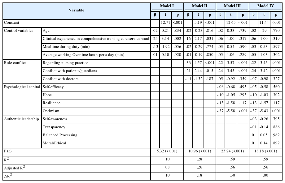 Burnout showed a correlation with role conflict (r=.45, p<.001), positive psychological capital (r=-.62, p<.001) and authentic leadership (r=-.24, p<.001). In the regression analysis, the factors significantly associated with burnout included conflict with patients/guardians (β=.24, p<.001) and conflict regarding nursing practices (β=.22, p<.001), which are subdomains of role conflict. Among the components of positive psychological capital, optimism (β=-.37, p<.001) was identified as a significant protective factor against burnout. However, authentic leadership was not found to be a statistically significant predictor.