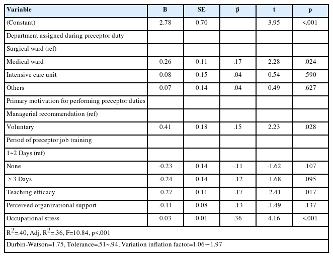 Participants included 156 nurses who had at least one month of preceptor experience within the past year. Data were collected using a structured self-report questionnaire and analyzed with SPSS version 27.0. Descriptive statistics, independent sample t-tests, one-way analysis of variance with Scheffé post-hoc tests, Pearson’s correlation analysis, and multiple regression analysis were performed.
