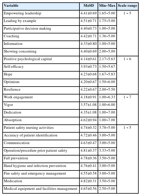 본 연구에서 수집된 자료는 IBM SPSS version 29.0 (IBM Corp.)을 이용하여 다음과 같이 분석하였다. 연구 대상자의 일반적 특성과 간호사가 인식한 간호단위관리자의 임파워링리더십, 간호사의 긍정심리자본, 직무 열의, 환자안전간호활동 정도는 기술통계로 분석하였다. 주요 변수에 대한 정규성 검정은 모수 통계기법 적용을 위한 전제 조건 확인을 위해 Kolmogorov-Smirnov 검정을 실시하였다.