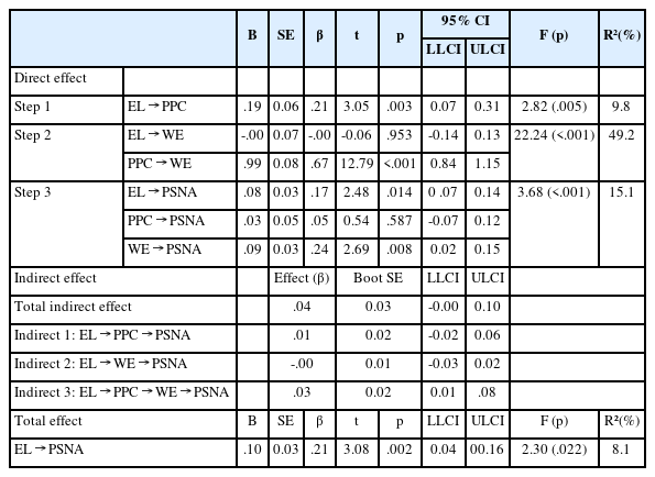 22]의 PROCESS Macro (model 6)를 사용하여 분석하였다. 간접효과와 총간접효과의 유의성 검정을 위해 10,000회의 부트스트래핑(bootstrapping)을 적용하였으며, 95% 신뢰구간에서 ‘0’을 포함하지 않으면 간접효과가 유의한 것으로 해석하였다.