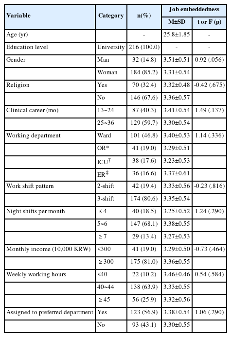 Table 4.Factors Affecting Job Embeddedness (N=216)