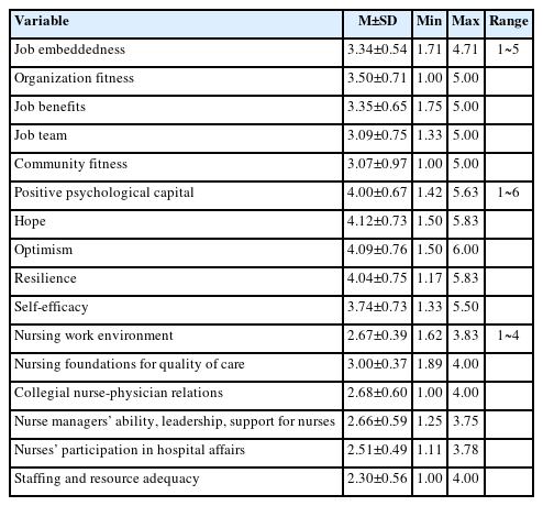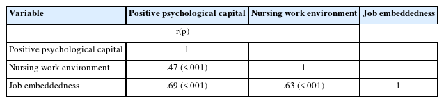 Table 3.Correlations between Job Embeddedness, Positive Psychological Capital, and Nursing Work Environment (N=216)