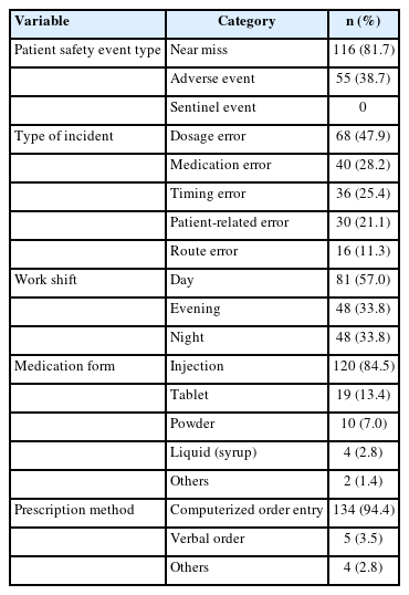 19]를 참고하여 구성한 문항으로, 일반적 특성과 함께 조사하였다. 최근 3개월간 경험한 투약안전사건의 유형과 특성을 복수로 모두 선택하도록 하였으며, 투약안전사건경험이 ‘있다’라고 응답한 대상자 142명의 자료만 분석에 포함하였다. 대상자의 최근 3개월 이내 투약안전사건경험 특성에 대해 다중응답으로 조사한 결과, 위해 정도는 근접오류 116명(81.7%), 위해사건 55명(38.7%), 적신호 사건 0명(0.0%)이었다. 대상자가 경험한 투약안전사건경험에서의 사건 종류는 용량 관련 오류 68명(47.9%)이 가장 높았고, 투약안전 사건발생 근무시간은 주간(day)이 81명(57.0%)으로 가장 많았다. 발생 약물 제형은 주사제 120명(84.5%), 발생 처방 형태는 전산화 처방 입력 시스템(computerized order entry)이 134명(94.4%)으로 과반수 이상인 것으로 나타났다(