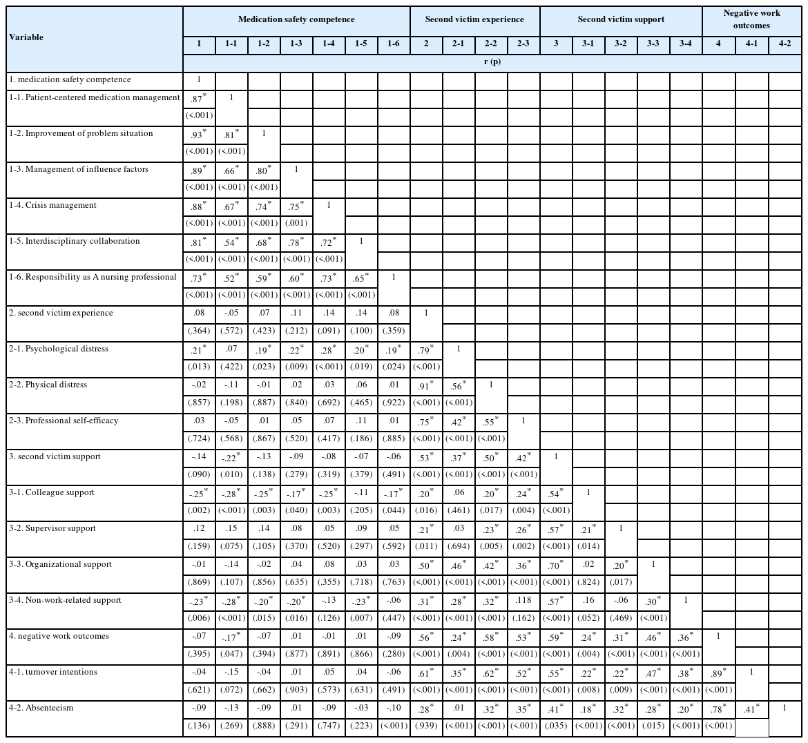 The mean scores were as follows: medication safety competence (4.10±0.43), second victim experience (3.37±0.61), second victim support (3.12±0.30), and negative work outcomes (2.68±0.72). Medication safety competence was negatively correlated with negative work outcomes (r=-.17, p=.047) and positively correlated with psychological distress, a subdomain of second victim experience (r=.21, p=.013). Second victim experience was positively correlated with both second victim support (r=.53, p<.001) and negative work outcomes (r=.56, p<.001).