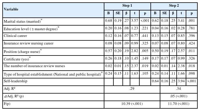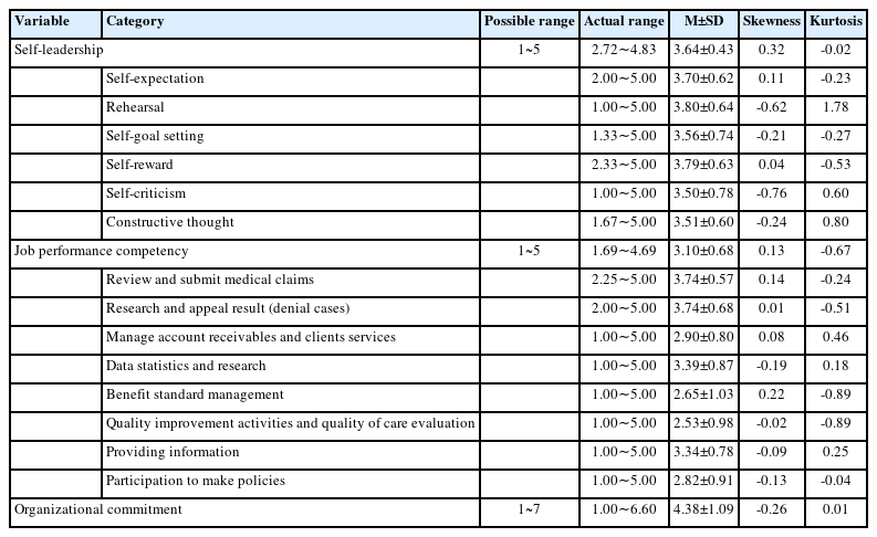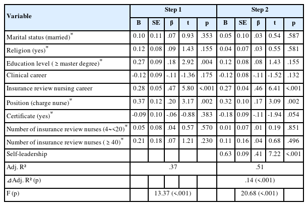 The mean score for self-leadership was 3.64±0.43 out of 5, for job performance competency was 3.10±0.68 out of 5, and for organizational commitment was 4.38±1.09 out of 7. Statistically significant positive correlations were observed among self-leadership, job performance competency, and organizational commitment in insurance review nurses. Hierarchical multiple regression analysis showed that self-leadership explained an additional 13.9 percentage points of variance in job performance competency and an additional 5.3 percentage points in organizational commitment. Self-leadership emerged as a statistically significant predictor of both job performance competency and organizational commitment.