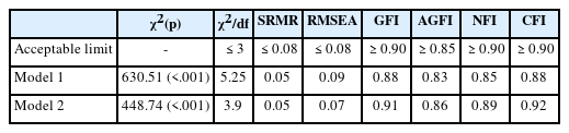 χ2/df는 3 이하, SRMR과 RMSEA는 0.08 이하, GFI는 0.9 이상, AGFI는 0.85 이상, NFI와 CFI는 모두 0.9 이상일 때 적합하다고 판단하였다[