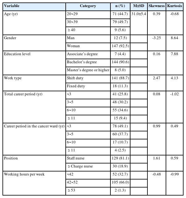 Table 1). 대상자의 평균 연령은 31.0±5.4세였으며, 연령 분포는 20대(71명, 44.7%), 30대(79명, 49.7%)였다. 성별은 여성(147명, 92.5%), 교육수준에서는 학사(144명, 92.5%)가 대부분이었다. 근무형태는 교대근무 141명(88.7%), 고정근무 18명(11.3%), 임상 근무경력은 6년에서 10년 이하(55명, 34.6%), 3년에서 5년 이하(48명, 30.2%), 3년 미만(41명, 25.8%), 암병동 근무경력은 3년 미만(78명, 49.1%), 3년에서 5년 이하(60명, 37.7%), 6년에서 10년 이하(17명, 10.7%) 순이었다. 직위는 대부분 일반간호사(129명, 81.1%)였으며, 주당 근무시간은 42시간에서 52시간 이하(105명, 66%), 42시간 미만(52명, 32.7%) 순이었다.