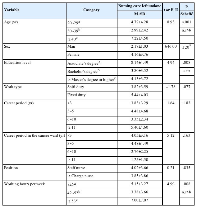 (2) 대상자의 일반적 특성에 따른 미완료 간호에 대한 차이는 independent t-test (Mann-Whitney U-test), one-way analysis of variance (ANOVA) 및 사후검정 Scheffé test를 실시하였다.