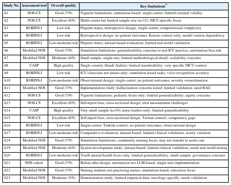 Table 2. Overall, the included studies demonstrated moderate to high methodological quality, although quality varied by study design. The experimental studies generally showed low to moderate risk of bias, with appropriate use of objective outcome measures, though blinding was inconsistently applied. Cross-sectional studies received strong ratings on the Newcastle–Ottawa Scale (scores 6–8/9), although several lacked justification for sample size. Qualitative studies demonstrated strong methodological rigor, including transparent analytic procedures and reflexivity. Simulation studies showed adequate design validity with clinically realistic scenarios, but limited generalizability to real-world practice. Implementation and demonstration studies provided valuable feasibility and preliminary outcome data but were constrained by small samples, limited controlled comparisons, and short follow-up periods. Common methodological limitations across studies included small sample sizes, single-site recruitment, limited longitudinal outcome measurement, and insufficient reporting of patient-level impact. Despite these limitations, the overall evidence base offers sufficient methodological strength to inform preliminary conclusions about the role of generative AI in nursing decision-making. It is important to note that the evidence base comprises studies with varying levels of evidence strength. Experimental studies (n=4) and randomized controlled trials (n=2) provide higher-level evidence for causal inferences, while cross-sectional studies (n=6), simulation studies (n=4), and pilot studies (n=4) offer preliminary or exploratory evidence. Qualitative studies (n=5) provide important insights into implementation experiences and contextual factors but do not establish effectiveness. This heterogeneity in study designs means that findings should be interpreted with consideration of the strength and certainty of evidence for each specific outcome or application domain. Meta-analysis was not feasible due to this heterogeneity, and our synthesis reflects the current state of an emerging field where high-quality experimental evidence is still accumulating.