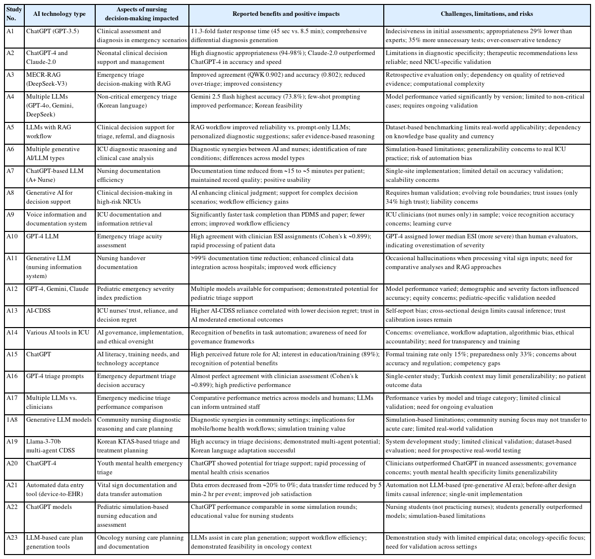 17]. Despite growing interest and implementation, the evidence base regarding generative AI's impact on nursing decision-making remains fragmented across various study designs, clinical settings, and AI technologies [