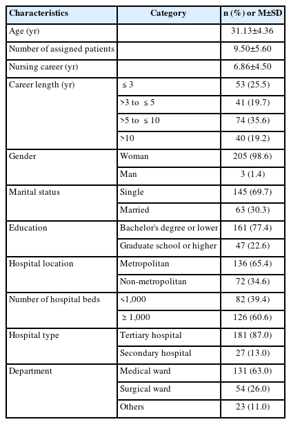 분석 대상이 된 208명 중 교대제 개선 시범사업 참여 병동에 근무하는 간호사는 124명(59.6%), 미참여 병동에 근무하는 간호사는 84명(40.4%)이었다. 4년제 대학 졸업자(156명, 75%)와 미혼(145명, 69.7%)이 과반 이상을 차지하였고, 간호사 경력은 평균 6.86±4.50년이었다. 경력 기간별로는 3년 이하가 53명(25.5%), 3년 초과 5년 이하가 41명(19.7%), 5년 초과 10년 이하가 74명(35.6%), 10년 초과가 40명(19.2%)이었다. 근무하는 병원은 수도권(136명, 65.4%)과 1,000병상 이상의 병원(126명, 60.6%)이 많았다(