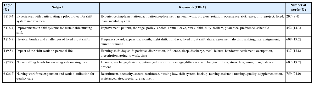 본 연구는 교대제 개선 시범사업에 대한 간호사의 경험과 견해, 교대근무제 개선을 위한 정책 제언에 관한 개방형 응답을 STM으로 분석한 서술적 탐색 연구이다.