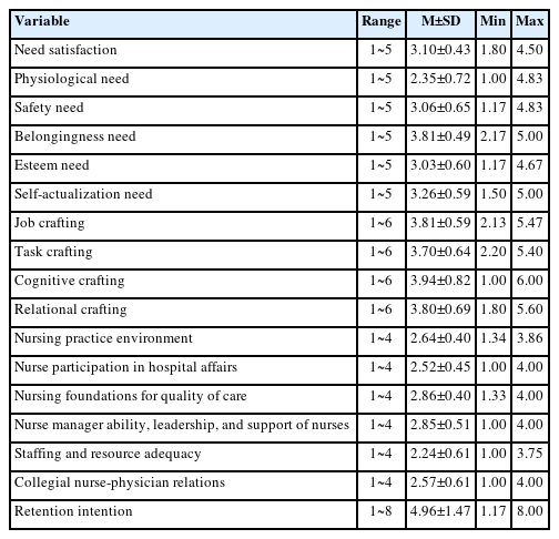 Table 3.Correlations between Needs Satisfaction, Job Crafting, Nursing Practice Environment and Retention Intention (N=194)