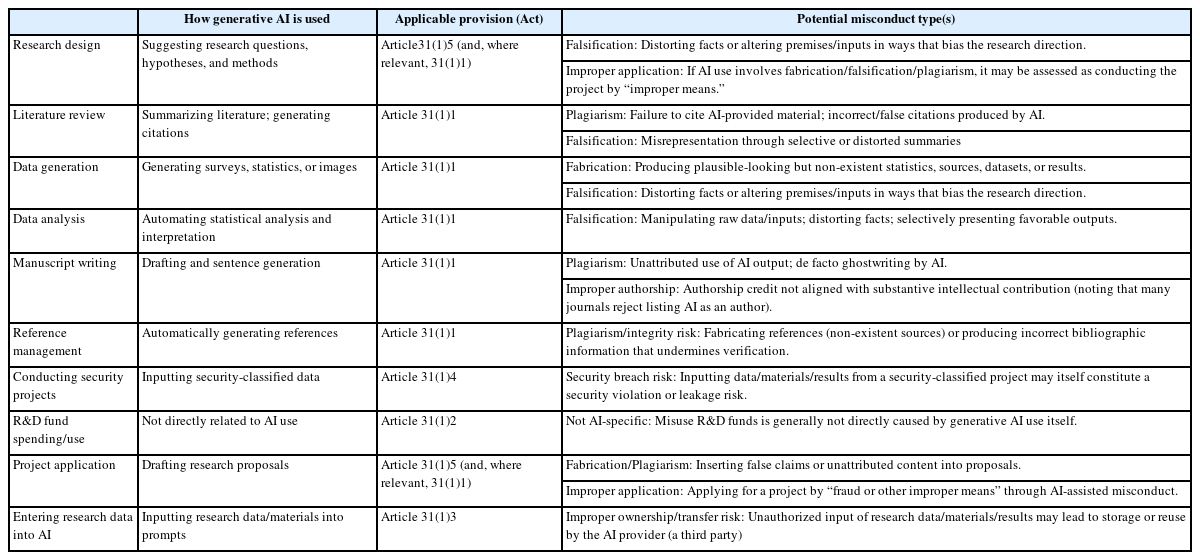 Through doctrinal legal analysis of Article 31 of the Act and Article 56 of the Enforcement Decree, common AI-assisted practices across the research cycle—design, literature review, data generation and analysis, manuscript writing, and the input of data into AI systems—were mapped to the Act’s misconduct taxonomy and related legal duties.