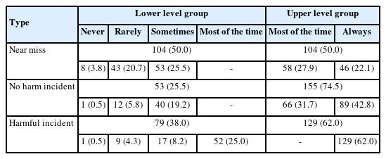 Purpose This study aimed to examine the predictors of nurses’ incident reporting by dividing the level of patient safety incident (near miss, no harm, harmful incident) reporting into upper and lower level groups. Methods: Data were collected from 208 nurses working in a hospital from March 29 to April 6, 2022. Logistic regression analysis was used to determine the predictors of nurses’ reporting level. Results: Predictors of the upper level group of near miss reporting were belief in improvement (odds ratio [OR], 2.40; 95% confidence interval [CI], 1.27-4.53), reporting intention (OR, 2.00; 95% CI, 1.15-3.47), patient safety knowledge (OR, 2.16; 95% CI, 1.16-4.01). Predictors of the upper level group no harm incidents reporting were reporting training (OR, 1.38; 95% CI, 1.01-1.90), belief in improvement (OR, 2.00; 95% CI, 1.01-3.95), patient safety knowledge (OR, 2.41; 95% CI, 1.17-4.98). In the case of harmful incident reporting, the predictor was patient safety attitude (OR, 9.32; 95% CI, 2.77-31.38). Conclusion: The reporting level varies depending on the type of patient safety incidents. Managing nurses' individual characteristics, such as their beliefs in improvement, patient safety knowledge, and attitude is a key strategy for enhancing incident reporting level. Nursing managers should be aware that not all harmful incidents are being reported.