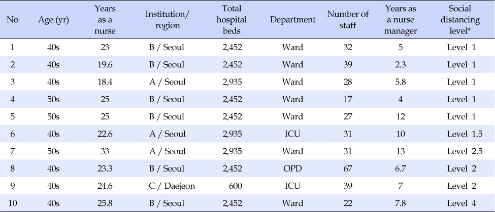 S시, D시에 위치한 상급종합병원의 간호관리자 10인이 심층 면담에 참여하였다. 상급종합병원은 총 세 곳으로, 간호관리자의 연령은 45세에서 57세(평균 48.5세)의 여성이었다. 근무 부서는 외래 1명, 중환자실 2명이었으며, 그 외는 모두 병동이었다. 총 임상 경력은 18년 5개월에서 33년(평균 24년)이었으며, 관리자 경력은 2년 3개월에서 13년(평균 7.3년)이었다. 부서원의 수는 17명에서 67명(평균 33.3명)으로 매우 다양하였다(Table 1).