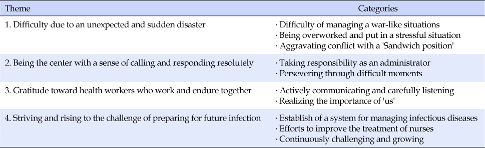 Results: The following four themes were derived: difficulty due to an unexpected and sudden disaster, being the center with a sense of calling and responding resolutely, gratitude toward health workers who work and endure together, and striving and rising to the challenge of preparing for future infection.