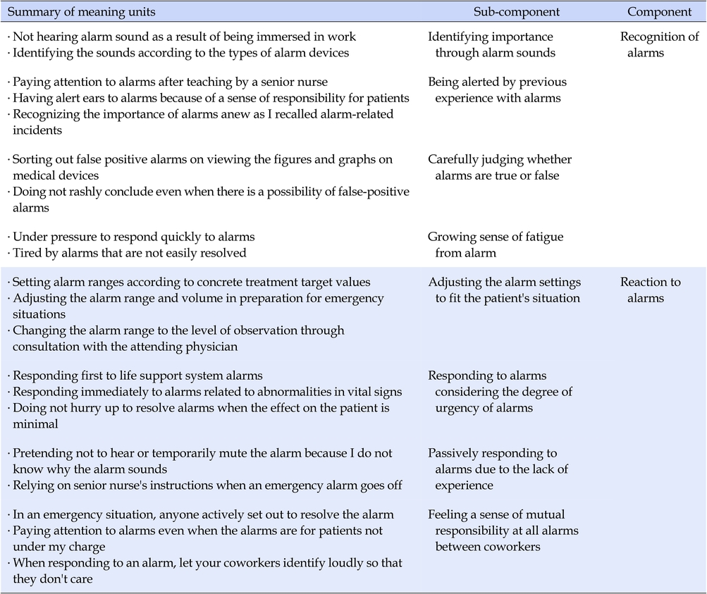 중환자실 간호사가 경험한 알람 반응 경험은 2개의 구성요소와 8개의 하위 구성요소, 20개의 의미단위요약으로 도출되었다(Table 1).