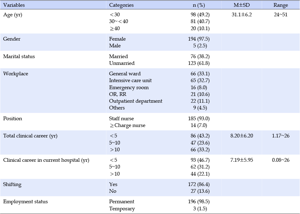 대상자의 성별은 여성이 194명(97.5%)으로 거의 대부분을 차지했다. 평균 연령은 31.1±6.2세로, 30세 미만이 98명(49.2%)으로 가장 많았다. 미혼이 123명(61.8%)이었으며, 근무부서는 병동 66명(33.1%), 중환자실 65명(32.7%), 외래 22명(11.1%)의 순으로 나타났다. 대상자의 직위는 일반간호사가 185명(93.0%), 책임간호사 이상이 14명(7%)이었다. 직무와 관련해서 대상자의 평균 임상경력은 8.20±6.20년이었으며, 현 병원 평균 근무경력은 7.19±5.95년이었다. 교대 근무를 하는 경우가 172명(86.4%)으로 나타났고, 정규직인 경우가 196명(98.5%)으로 대부분을 차지했다(Table 1).