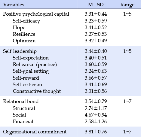 대상자의 긍정심리자본, 셀프리더십, 관계유대, 조직몰입 평균은 Table 2와 같다. 5점 만점인 간호사의 긍정심리자본은 3.31±0.44점이었고, 셀프리더십은 3.44±0.40점이었다. 7점 만점으로 측정한 관계유대는 3.54±0.79점이었고, 조직몰입은 3.81±0.76점이었다. 구체적인 하부 영역을 살펴보면 긍정심리자본은 희망 3.41±0.52점, 낙관주의 3.32±0.49점, 복원력 3.27±0.53점, 자기효능감 3.23±0.59점 순이었다. 셀프리더십은 자기보상 3.66±0.57점, 리허설 3.60±0.59점, 자기비판 3.41±0.69점, 자기기대 3.40±0.51점, 건설적 사고 3.31±0.56점, 목표 설정 3.24±0.63점의 순으로 나타났다. 관계유대는 사회적 유대 4.67±0.94점, 구조적 유대 2.74±1.17점, 재무적 유대 2.58±1.26점의 순으로 나타났다.