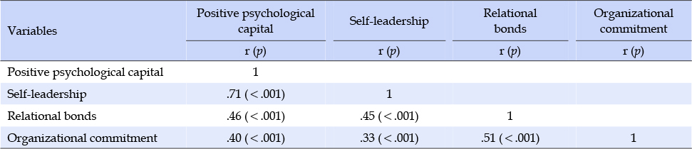 • 긍정심리자본, 셀프리더십, 관계유대와 조직몰입의 관련성은 Pearson's correlation coefficients로 분석하였다.