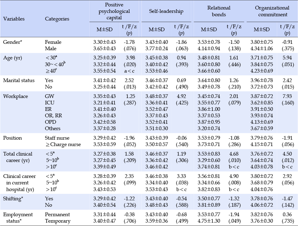• 연구대상자의 일반적 특성에 따른 긍정심리자본, 셀프리더십, 관계유대, 조직몰입의 차이는 Independent t-test, one-way ANOVA 및 Scheffé test, Mann-Whitney Utest로 분석하였다.