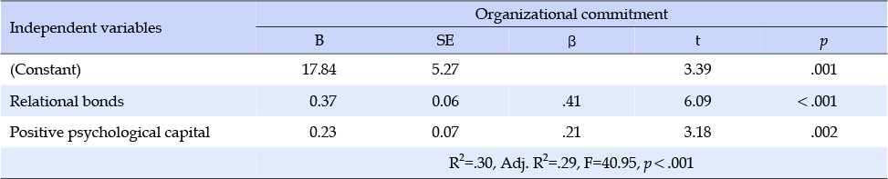 병원 간호사의 조직몰입에 영향을 미치는 요인을 확인하기 위해 다중회귀분석을 이용하였고, 분석한 결과는 Table 5와 같다. 대상자의 일반적 특성에서 차이가 있었던 결혼 유무와 총 임상경력을 더미변수화하였다. 또한, 조직몰입과 상관관계를 보였던 긍정심리자본, 셀프리더십, 관계유대를 독립변수로 하여 단계선택법을 이용하여 분석한 결과 결혼유무와 총 임상경력, 셀프리더십은 유의하지 않은 것으로 확인되어 제거하였다. Durbin-Watson을 이용하여 오차의 자기상관을 검정한 결과 1.651로 자기상관 없이 독립적인 것으로 나타났다. 분산팽창인자는 1.263으로 10 미만이었으며, 공차한계는 .792로 0.1 이상이므로 다중공선성의 문제는 없는 것으로 나타났다. 조직몰입의 영향요인은 긍정심리자본, 관계유대로 나타났으며(F=40.95, p<.001), 구체적으로 관계유대(β=.41, p<.001), 긍정심리자본(β=.21, p=.002)이 각각 조직몰입에 유의한 영향을 미치고, 이들 변수들이 조직몰입을 29.0% 설명하는 것으로 나타났다.
