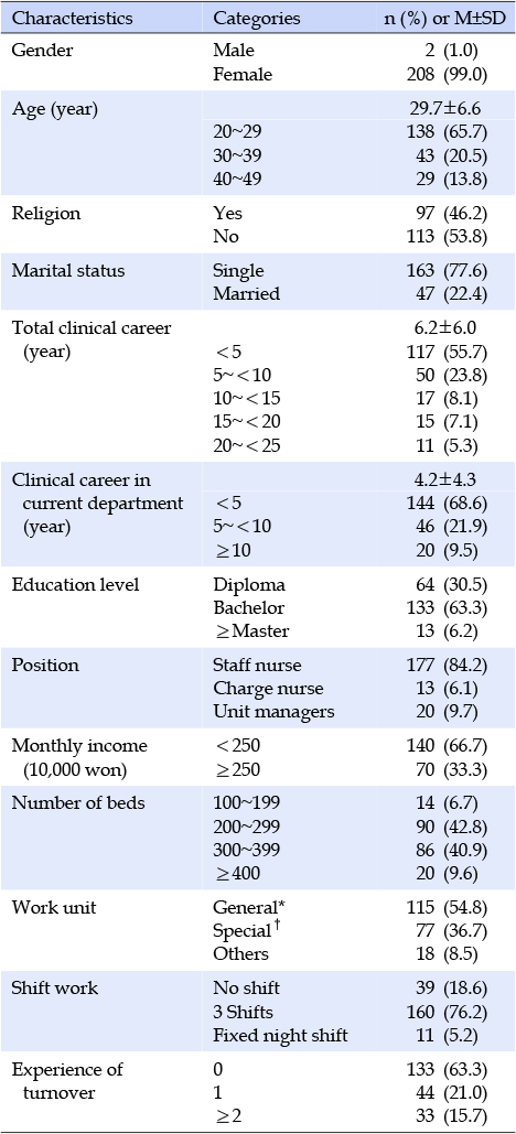 연구대상자의 일반적 특성을 분석한 결과, 대상자는 대부분 여성이었고(99.0%), 연령은 20대가 138명(65.7%)으로 가장 많았다. 종교는 없는 경우가 113명(53.8%)으로 과반수 이상이었으며 미혼이 163명(77.6%)으로 기혼보다 많았다. 총임상경력은 5년 미만이 117명(55.7%)이었고, 현재부서 경력도 5년 미만이 144명(68.6%)으로 가장 많았다. 교육정도는 4년제 대학 졸업이 133명(63.3%), 직위는 일반간호사가 177명(84.2%)으로 가장 많았고 월급은 250만원 미만이 140명(66.7%)이었다. 근무하는 병원은 200병상 이상 300병상 미만인 경우가 90명(42.8%)으로 가장 많았고, 근무하는 병동은 일반병동이 115명(54.8%)으로 가장 많았다. 대부분의 대상자는 3교대(76.2%)을 하고 있었으며, 1회 이상 이직한 경험이 있는 경우는 대상자의 36.7%로 나타났다(Table 1).