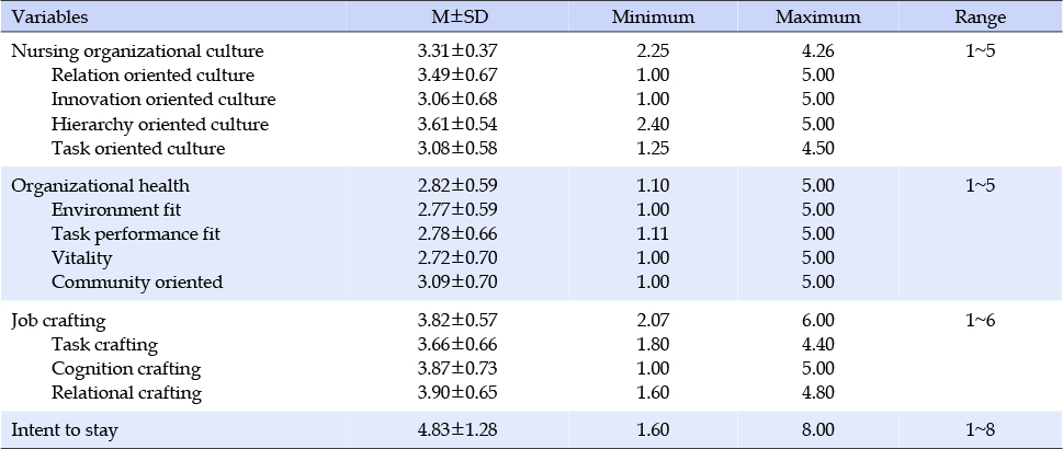 대상자가 지각한 간호조직문화는 평균평점 3.31±0.37점(5점 만점)이었고 하위영역 중 위계지향적 문화가 3.61±0.54점으로 가장 높았고 관계지향적 문화 3.49±0.67점, 업무지향적 문화 3.08±0.58점, 혁신지향적 문화 3.06±0.68점 순으로 나타났다. 조직건강은 평균평점 2.82±0.59점(5점 만점)이었고 하위영역 중 공동체 지향이 3.09±0.70점으로 가장 높았고, 과업수행적합성 2.78±0.66점, 환경적합성 2.77±0.59점, 활기 2.72±0.70점 등의 순으로 나타났다. 잡 크래프팅은 평균평점 3.82±0.57점(6점 만점)이었으며 하위영역 중 관계 크래프팅이 3.90±0.65점으로 가장 높았고, 인지 크래프팅 3.87±0.73점, 업무 크래프팅이 3.66±0.66점이었다. 재직의도는 평균평점 4.83±1.28점(8점 만점)이었다(Table 2).