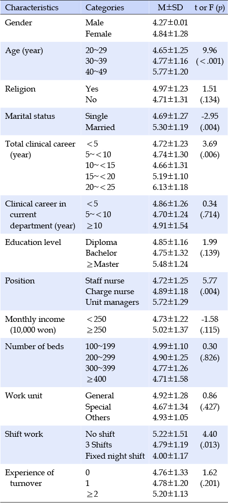 일반적 특성에 따른 재직의도 정도는 연령(F=9.96, p<.001), 결혼유무(t=-2.95, p=004), 총임상경력(F=3.69, p=.006), 직위(F=5.77, p=.004), 근무형태(F=4.40, p=.013)에 따라 유의한 차이가 있었다(Table 3).