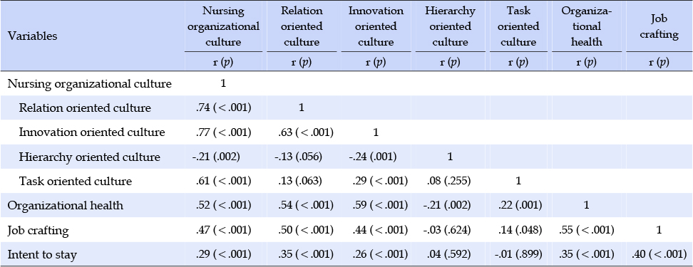 재직의도는 간호조직문화(r=.29, p<.001), 간호조직문화의 하위영역인 관계지향적 문화(r=.35, p<.001), 혁신지향적 문화(r=.26, p<.001)와 유의한 정적 상관관계가 있었다. 또한 재직의도는 조직건강(r=.35, p<.001)과 잡 크래프팅(r=.40, p<.001)과 정적 상관관계가 나타났다(Table 4).