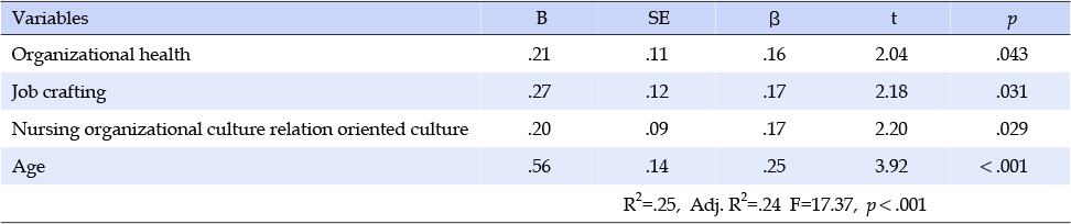 대상자의 재직의도에 미치는 영향요인을 파악하기 위하여 대상자의 일반적 특성 중 유의한 차이를 보인 연령, 결혼유무, 총임상경력, 직위, 근무형태 및 간호조직문화의 하위영역인 관계지향적 문화와 혁신지향적 문화, 조직건강, 잡 크래프팅 변인에 대하여 단계적 회귀분석을 실시하였다. 분석결과, 대상자의 재직의도에 영향을 미치는 요인은 관계지향적 간호조직문화(β=.17 p=.029), 조직건강(β=.16 p=.043), 잡 크래프팅(β=.17, p=.031), 연령(β=.25, p<.001)이었고, 이들 요인에 의한 설명력은 25.0%였다(Table 5).