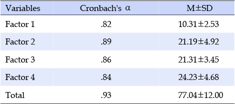 In the confirmatory factor analysis, CFI, TLI, and RMSR evaluation indices were appropriate except for RMSEA. Partial validity was shown in convergent validity, and discriminant validity. Exploratory factor analysis revealed that the questions were well organized with four factors. Cronbach's ⍺ of the whole instrument was .93.