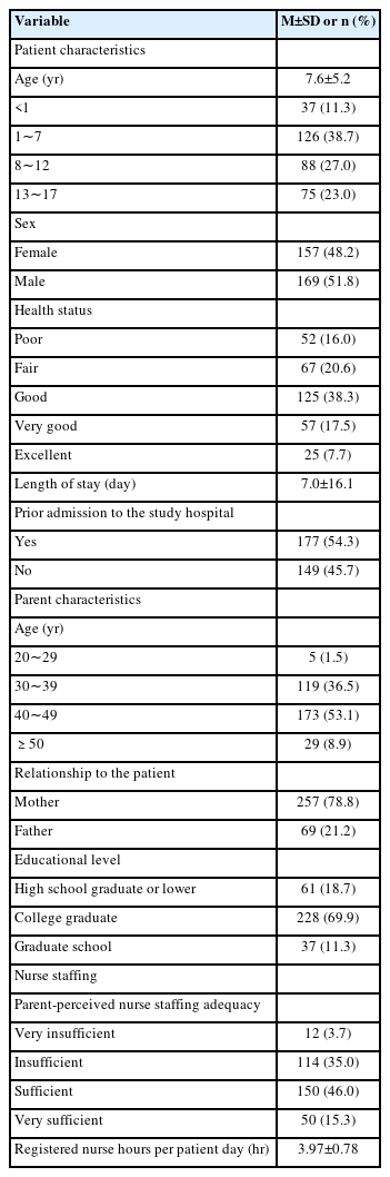 7]에 따르면 통계적으로 유효한 비교가 가능하기 위해서는 설문 완료자가 300명 이상이어야 하므로, 본 연구에서도 대상자 선정기준을 충족한 398명의 부모에게 설문조사를 안내하였고, 그중 329명이 참여하였다(응답률 82.7%). 그중 주요 변수에 응답하지 않은 3명은 제외하여 최종 326명이 분석에 포함되었다. 7개 병동별 응답자수는 최소 30명에서 최대 94명으로 분포하였다.