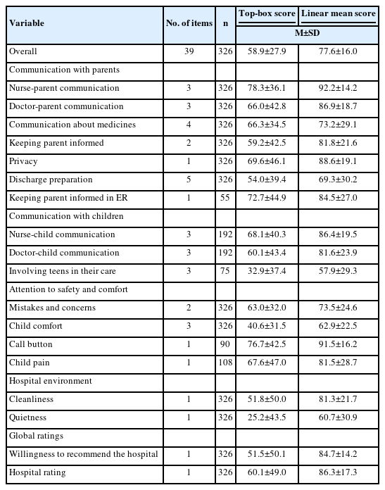 환자와 부모의 일반적 특성은 빈도와 백분율, 평균과 표준편차로 제시하였다. Child HCAHPS의 18개 영역별 점수는 두 가지 점수, 최고응답(top-box) 점수와 선형화(linear mean) 점수로 계산하였다. 최고응답 점수는 본 연구결과와 Child HCAHPS 선행연구 결과[