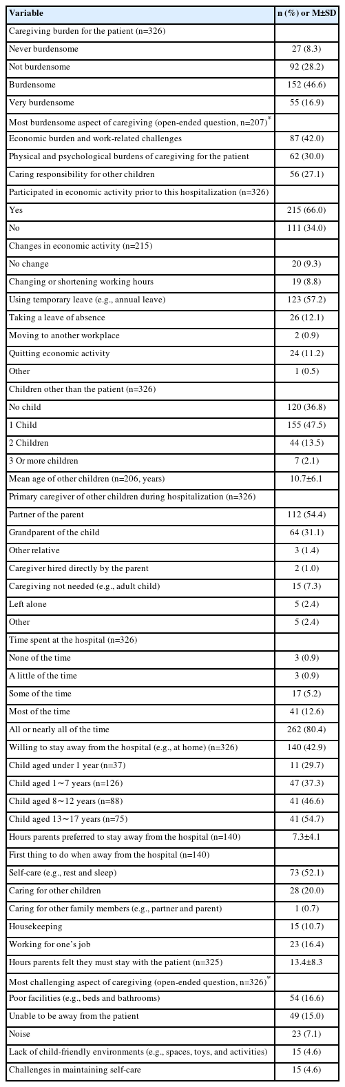 부모의 돌봄부담을 평가하기 위해 연구팀이 초기 문항을 개발하고, 아동병동 수간호사 10명의 전문가 검토를 거쳐 12개 문항으로 확정하였다. 먼저, 입원한 자녀를 돌보는 것이 부모의 일상적 삶의 유지에 부담을 준 정도(4점 척도: 전혀 부담되지 않았다∼매우 부담되었다)와 돌봄으로 인해 가장 부담되었던 것(주관식), 자녀 입원 전 경제활동 여부, 자녀 입원으로 인한 경제활동의 변화, 입원한 자녀 외의 자녀수/연령, 입원 중 다른 자녀의 주돌봄자를 질문하였다. Child HCAHPS에 포함된 ‘입원 중 병원에 머문 정도’ 항목은 5점 척도(머물지 않았다, 약간의 시간에, 어느 정도의 시간에, 대부분 시간에, 모든/또는 거의 모든 시간에)로 질문하였다. 다음으로 병원 여건이 갖추어져 부모가 자리를 비울 수 있다면 병원 밖에서 머물고 싶은지 여부와 원하는 시간대(주관식), 그 시간대에 하고 싶은 것, 부모가 자리를 비울 수 있다 하더라도 자녀 곁을 반드시 지켜야 한다고 생각하는 시간대(주관식), 입원한 자녀를 돌보며 가장 힘들었던 점(주관식)을 질문하였다.
