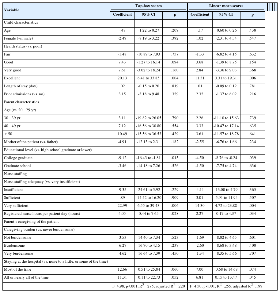 환자와 부모 특성, 간호사 배치수준, 부모의 돌봄부담이 환자경험에 미치는 영향을 파악하기 위해 다중선형회귀분석을 실시하였다. 종속변수인 환자경험은 전체 39개 항목의 평균값인 최고응답 종합점수와 선형화 종합점수를 산출하여 각각의 회귀모델에 포함하였다. 따라서 최고응답 종합점수와 선형화 종합점수가 높을수록 환자경험이 긍정적인 것을 의미한다. 환자와 부모가 경험하지 않아 응답하지 않은 문항(예: 호출벨 사용, 통증 등)은 결측치가 아니므로, 해당 문항을 제외한 나머지 문항의 종합점수를 계산하였다.