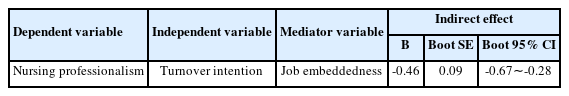 Table 4.Bootstrapping Results for the Mediating Effect of Job Embeddedness on the Relationship between Nursing Professionalism and Turnover Intention