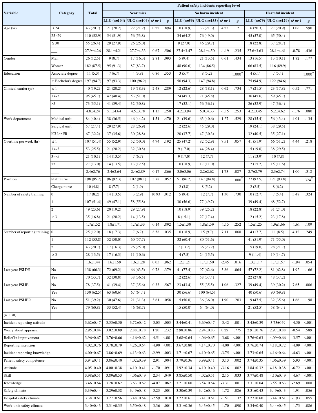 This study aimed to examine the predictors of nurses’ incident reporting by dividing the level of patient safety incident (near miss, no harm, harmful incident) reporting into upper and lower level groups.