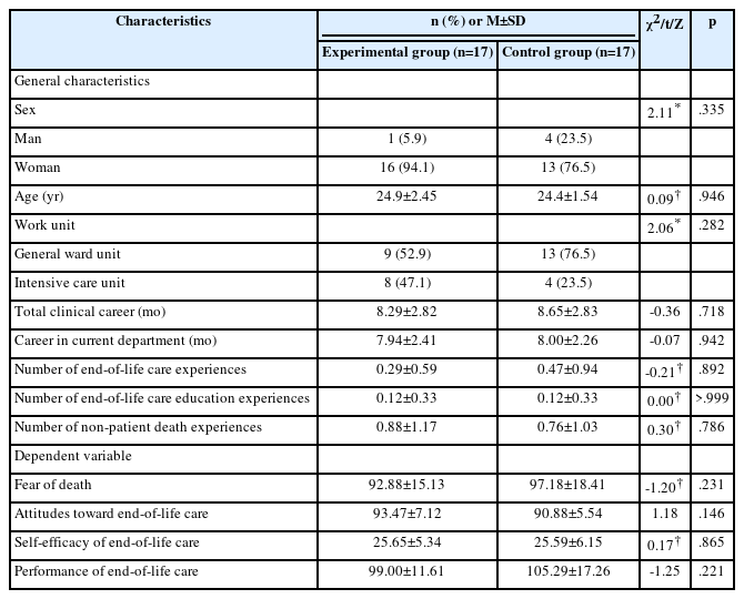 본 연구의 일반적 특성은 성별, 나이, 근무 부서, 총 임상경력, 현 부서 경력을 조사하였고, 임종 관련 특성은 임종간호 경험 횟수, 임종간호교육 경험 횟수, 환자 외 개인 임종 경험 횟수를 조사하였다.