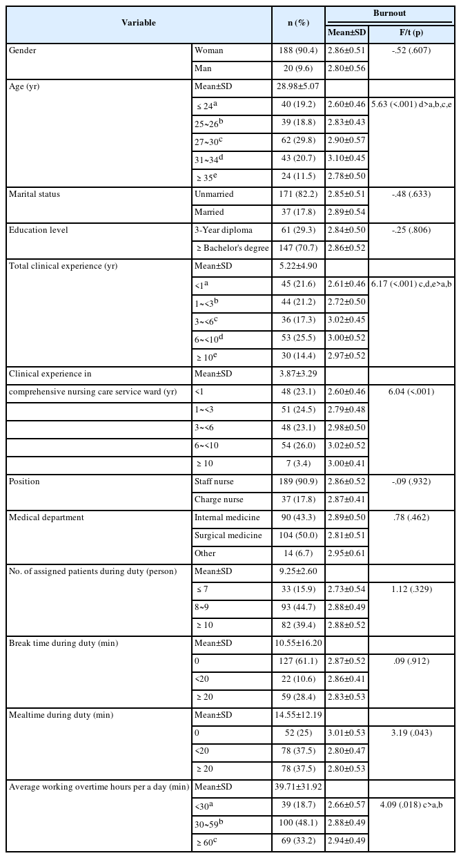 연구의 대상자의 성별은 대다수가 여성으로 188명(90.4%)이었다. 연령은 평균 28.98±5.07세였으며, 결혼 여부는 미혼이 171명(82.2%)으로 많았고, 최종 학력은 대학교 이상이 147명(70.7%)으로 가장 많았다. 총 임상경력은 평균 5.22±4.90년이었으며, 간호•간병통합서비스 병동 근무경력은 평균 3.87±3.29년이었다. 직위는 일반간호사가 189명(90.9%)으로 대다수였다. 월 급여는 300만 원~400만 원 미만 180명(86.5%)이 가장 많았다. 주 진료과는 외과계 104명(50.0%)으로 가장 많았다. 직전 근무 담당 환자 수는 평균 9.25±2.60명으로, 8명∼9명이 93명(44.7%), 10명 이상이 82명(39.4%) 7명 이하가 33명(15.9%)의 순으로 나타났다. 직전 근무 중 휴식시간은 평균 10.55±16.20분이었으며, 휴식시간이 없다고 응답한 군이 127명(61.1%)으로 가장 많았다. 직전 근무 중 식사시간은 14.55±12.19분이었으며, 직전 주간 일평균 초과근무시간은 평균 39.71±31.92분이었다.
