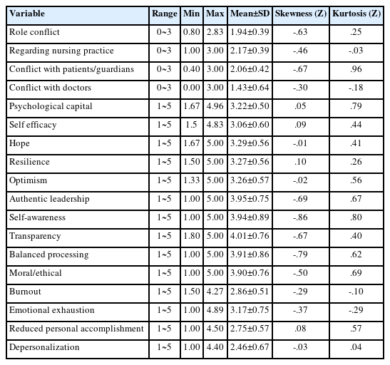 소진은 1∼5점 만점으로 평균 2.86±0.51점, 최소값 1.5점, 최대값은 4.27점이었다. 하부 영역을 살펴보면 정서적 탈진이 3.17±0.75점으로 가장 높았고, 개인적 성취감 감소 2.75±0.57점, 비인간화 2.46±0.67점 순으로 나타났다. 역할갈등은 0∼3점 만점으로 평균 1.94±0.39점, 최소값 0.8점, 최대값은 2.83점이었다. 하부 영역을 살펴보면 간호 고유 업무 관련 갈등이 2.17±0.39점으로 가장 높았으며, 환자/보호자와의 관계 갈등 2.06±0.42점, 의사와의 관계 갈등 1.43±0.64점 순으로 나타났다. 긍정심리자본은 1∼5점 만점으로 평균 3.22±0.50점, 최소값 1.67점, 최대값은 4.96점이었다. 하부 영역을 살펴보면 희망이 3.29±0.56점으로 가장 높았으며, 회복력 3.27±0.56점, 낙관주의 3.26±0.57점, 자기효능감 3.06±0.60점 순으로 나타났다. 진성리더십은 1∼5점 만점으로 평균 3.95±0.75점, 최소값 1점, 최대값은 5점이었다. 하부 영역을 살펴보면 관계적 투명성이 4.01±0.76점으로 가장 높았으며, 자아인식 3.94±0.89점, 균형적 정보처리 3.91±0.86점, 내면화된 도덕성 3.90±0.76점 순으로 나타났다(