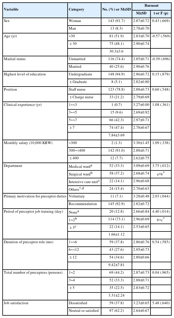 Participants included 156 nurses who had at least one month of preceptor experience within the past year. Data were collected using a structured self-report questionnaire and analyzed with SPSS version 27.0. Descriptive statistics, independent sample t-tests, one-way analysis of variance with Scheffé post-hoc tests, Pearson’s correlation analysis, and multiple regression analysis were performed.